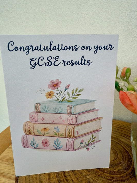 Congratulations on Your GCSE Results – Printed Card with Pastel Books & Florals