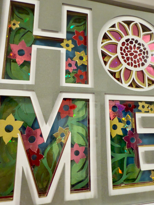 "HOME" with Sunflower – 3D Shadow Box Frame with Holographic Shine