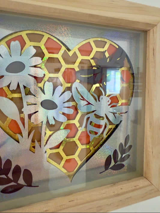 Bee and Honeycomb Heart Shadow Box – 20cm Handmade Papercut Wall Art with Pine Effect Frame