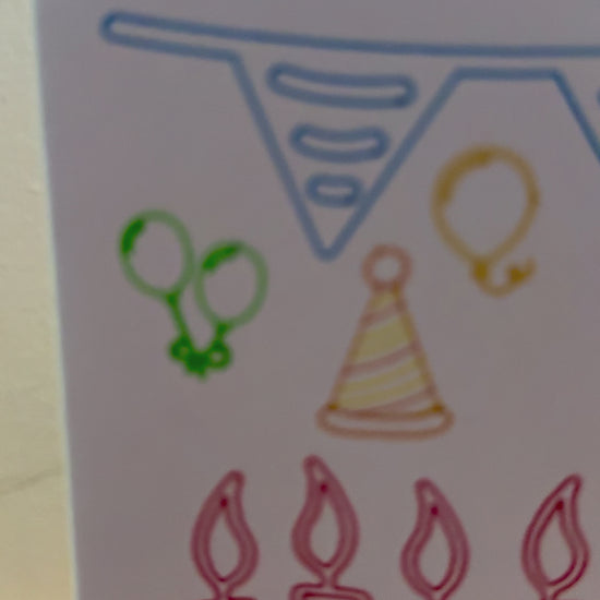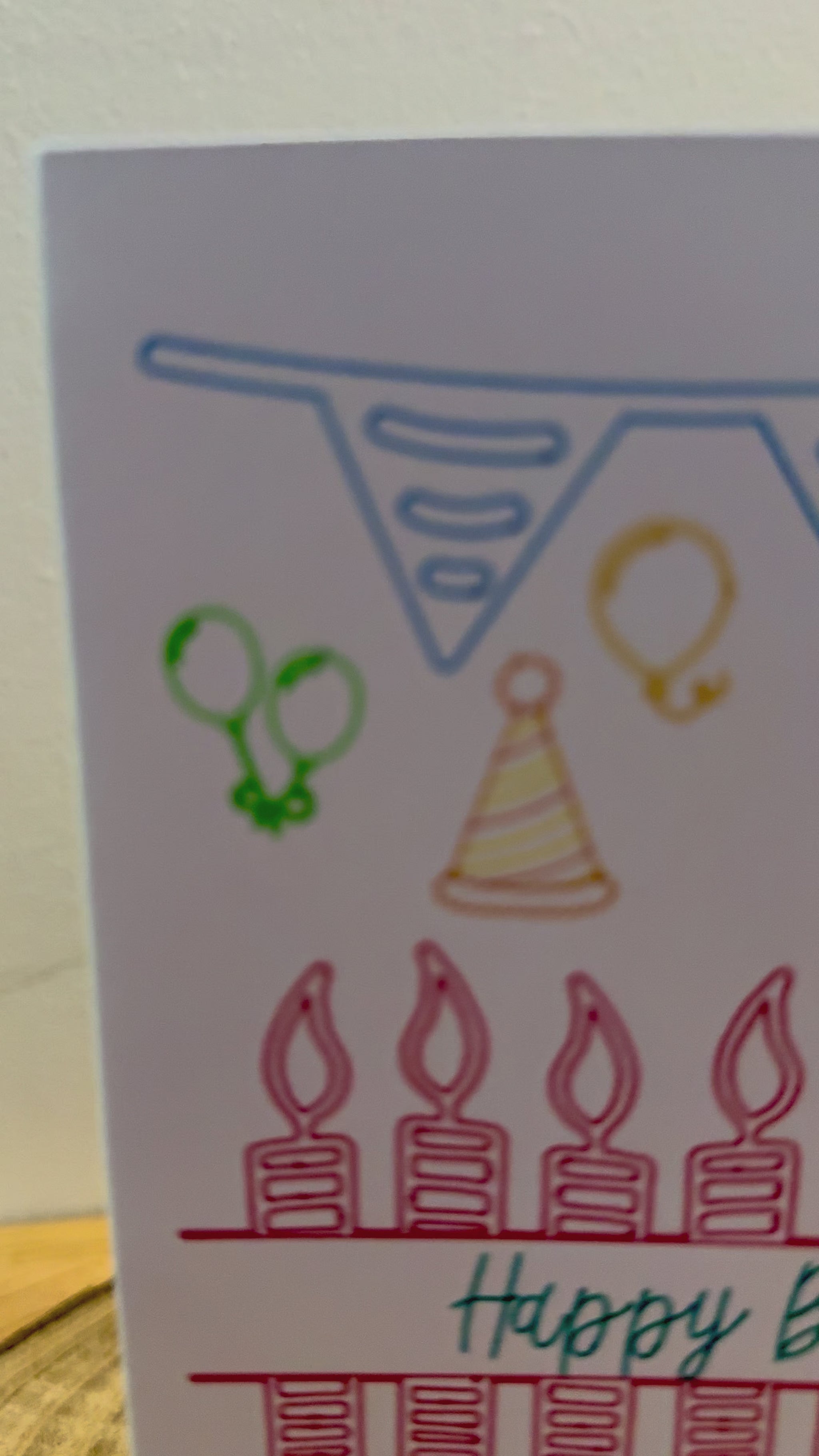 Perfect for the birthday legend who deserves a card bursting with celebration from top to bottom. This cheerful illustrated design is filled with colourful bunting, party hats, balloons, candles, and cake — all drawn in a crisp machine-sketched style that looks so hand-crafted they’ll think you’ve suddenly become an artistic genius.