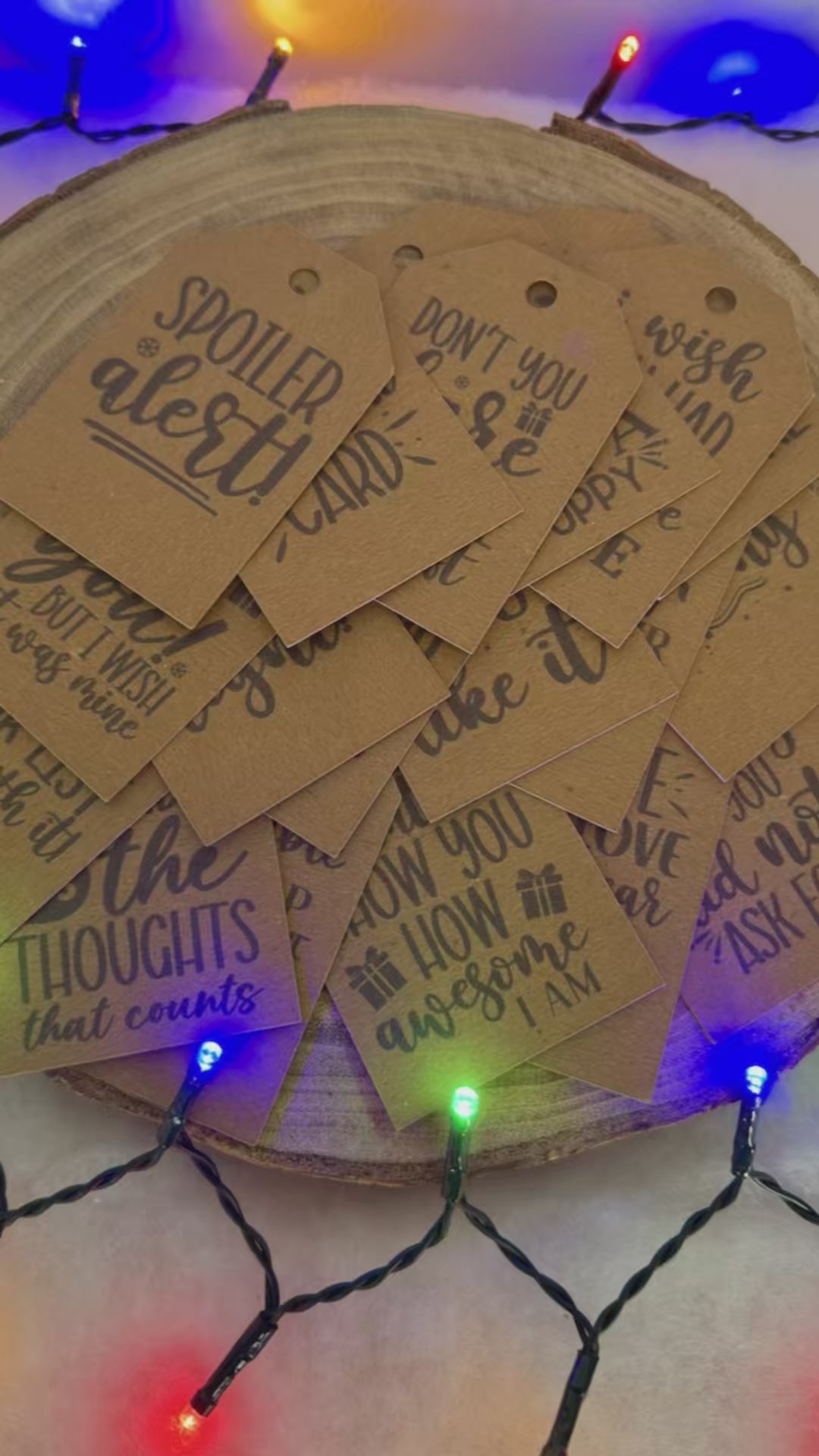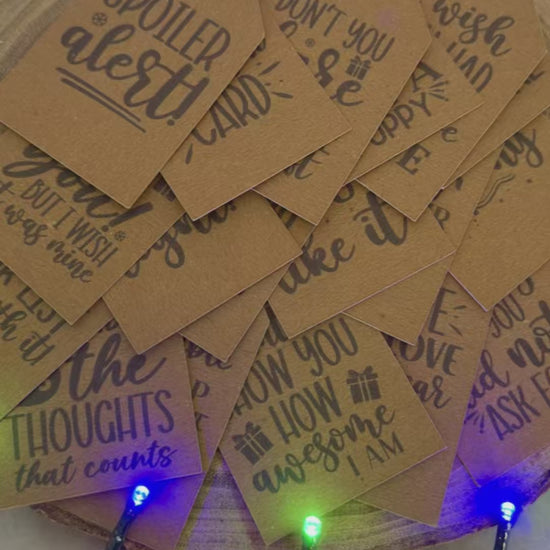 Each tag is printed with a different tongue-in-cheek message — the perfect way to get a laugh before the present is even opened. From playful digs to silly festive fun, these tags make wrapping as entertaining as the gifts themselves.
